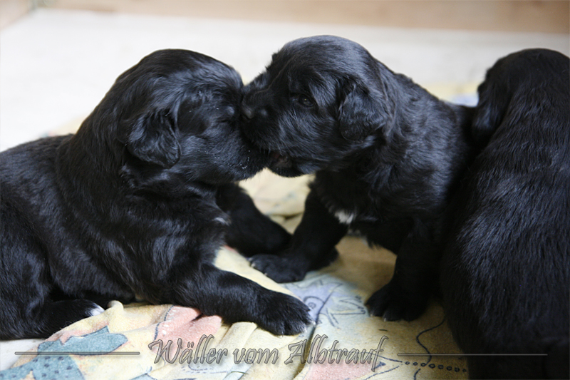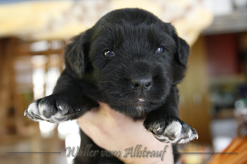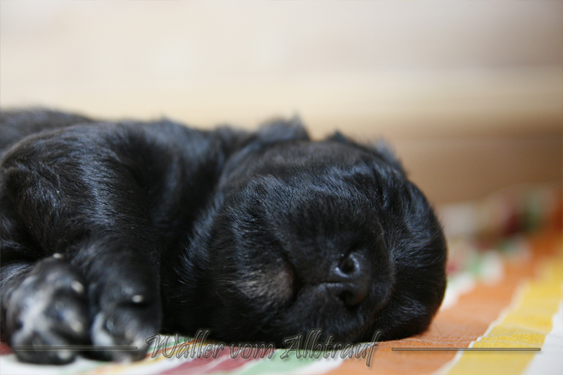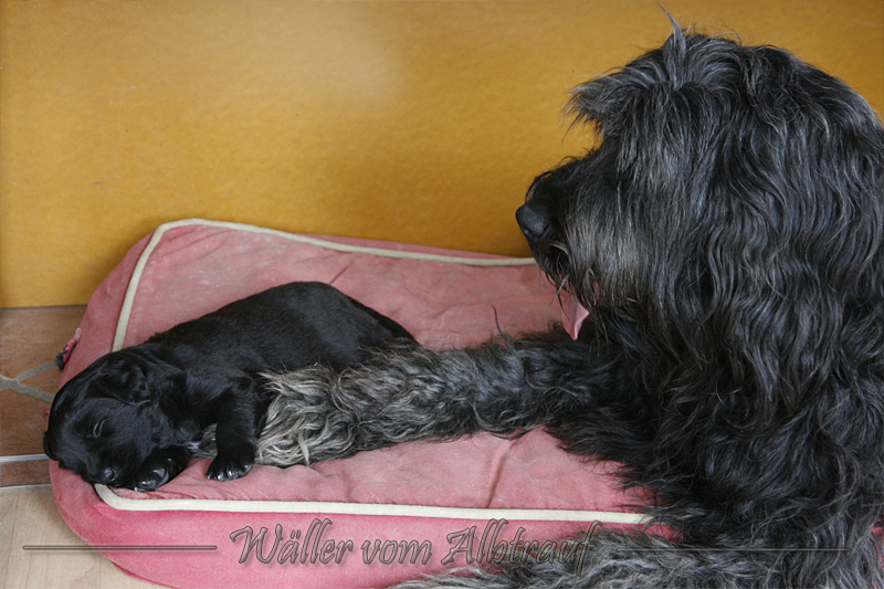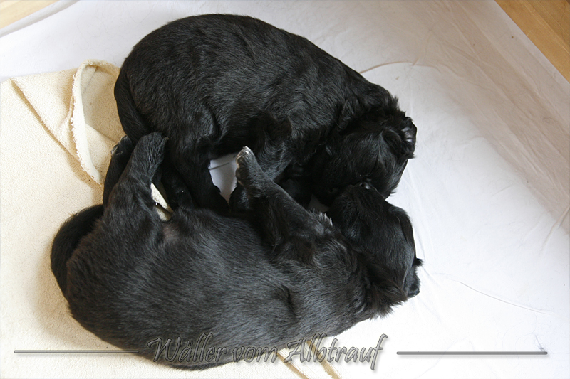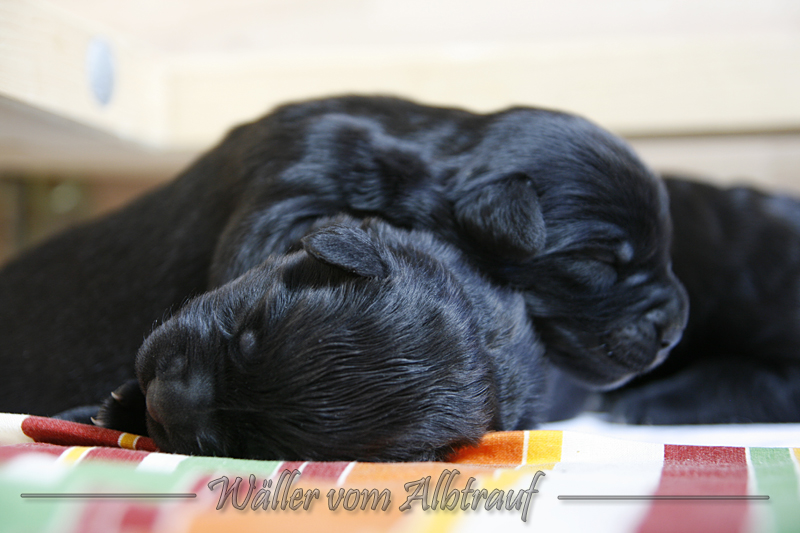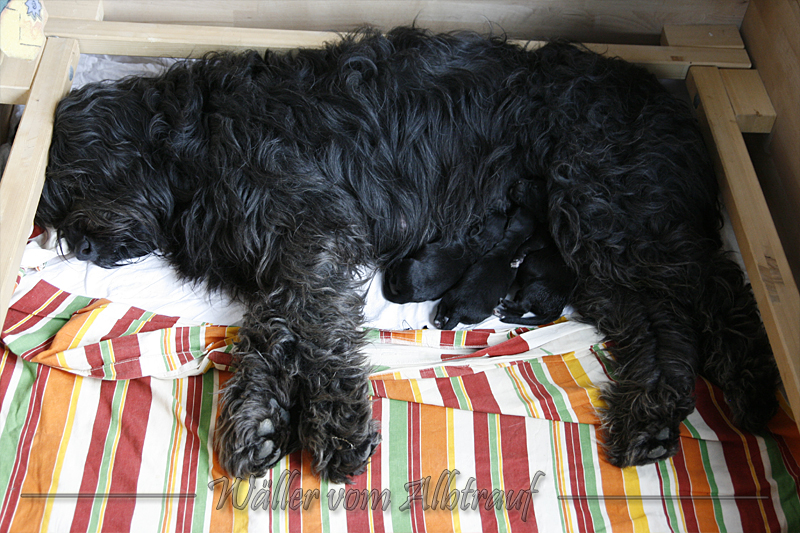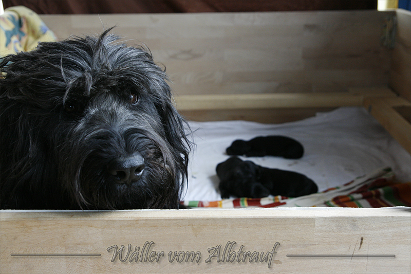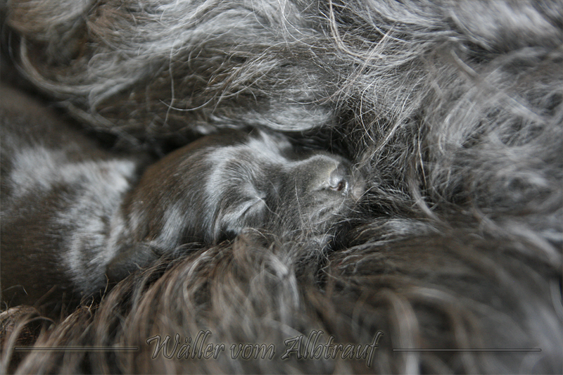 Die Geburt unserer C-Wurf Welpen war etwas speziell. Unser erster Welpe, eine Hündin, kam am 16.05. um 19.40 Uhr mit einem Geburtsgewicht von 386 gr auf die Welt. Zwei Stunden später, um 21.42 Uhr kam dann die zweite Hündin mit einem Geburtsgewicht von 398 gr auf die Welt. Nun warteten wir auf die Geburt weiterer Welpen, doch es kamen keine mehr. Cibi ging es gut, so dachten wir es bliebe bei diesen 2 Welpen. Einen Tag darauf bekam die Cibi dann aber nochmal Presswehen. Wir waren sehr erstaunt darüber. so ging das zweieinhalb Stunden. Zwischendurch immer mal wieder raus in den Garten und die Beine vertreten. Nichts passierte. Langsam machten wir uns Sorgen und riefen dann bei unserem Tierarzt an. Die Cibi brachte dann auf der Fahrt zum Tierarzt unseren kleinen Rüden zur Welt. Da lag er, fein säuberlich gereinigt, abgenabelt und zufrieden säugend.