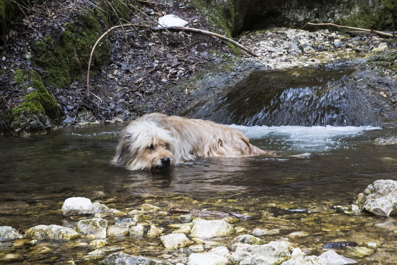 Am nächsten Tag mussten wir Fenati schonen, mit seinen 14 Wochen darf er noch nicht so belastet werden, deshalb haben wir uns getrennt. Birgit wollte den Weg zu den Schrammsteinen und Affensteinen erkunden, Dino hat eine Badestelle für die Hunde entdeckt. Außerdem hat Dino abends noch einmal die Bastei besucht um zu fotografieren. Am nächsten Tag war dann Dino mit der Wanderung durch die Affensteine zu den Schrammsteinen dran, er war begeitstert. Birgit hat einen ganz entspannten Panoramaweg für die Hunde gefunden. Auf der Wanderung zu den Affensteinen und Schrammsteinen gibt es leider Zugänge über Leitern, so dass diese mit den Hunden zum Teil nicht möglich sind. Es gibt zwar einen Vorschlag für eine Umgehung mit den Hunden, die schön ist, aber von den Felsformationen nicht ganz so berauschend ist. Wir bekamen den Tipp für das Buch " Wandern mit Hund im Elbsandsteingebirge", das haben wir noch nicht getestet, würden uns dies aber beim nächsten Mal kaufen, da es einige für Hunde unzugängliche Wege gibt. Ein Ausflug zu Enno, Eivys Bruder wollten wir auf jeden Fall machen, wenn wir schon in der Nähe sind. Die Hunde, und auch wir Menschen hatten einen tollen Nachmittag. Am Sonntag ging es dann zum "Kuhstall", das ist eine imposante Schichtfugenhöhle. Leider hatten am Sonntag noch viele Familien dieselbe Idee und so konnten wir uns nicht so ausbreiten wie wir das eigentlich wollten. Entschädigt hat uns dann am nächsten Tag die Wanderung zur Gautschgrotte und zum Aussichtspunkt Brand. Ein wildromantischer Weg startet im Polenztal. Zum Abschluss unseres Urlaubes sind wir noch gemeinsam im Polenztal gewandert. Die Hunde hatten viel Spaß in der Polenz, an der wir entlang gegangen sind. Fenati ist das erste Mal geschwommen, er hat sich auch als "Wasserwäller" entpuppt. Es gibt Vieles im Elbsandsteingebirge das wir noch gerne entdecken möchten. Wir waren sicher nicht das letzte Mal da.Wällerspaziergang 2. April 2016