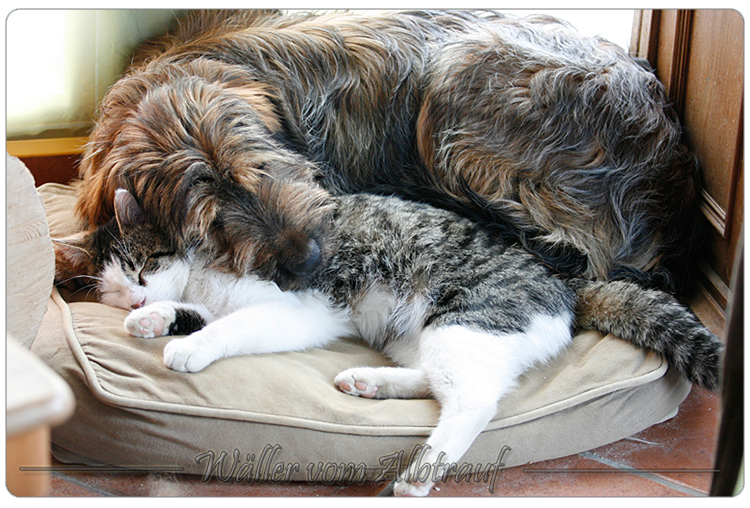 Henry lag zuerst auf dem Kissen. Obwohl es ziemlich klein ist hat sich die Batú noch dazu gelegt. Batú ist mittlerweile 59 cm groß bei einem Gewicht von 24,5 kg. |