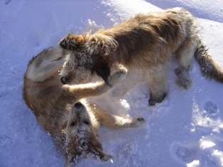 Wir treffen uns immer wieder mit der Gina, einer Schwester von Sam, die bei einem befreundeten Ehepaar von uns lebt.Auf diese Weise können wir nicht mit unseren Hunden spielen. Die beiden haben die größte Freude daran.