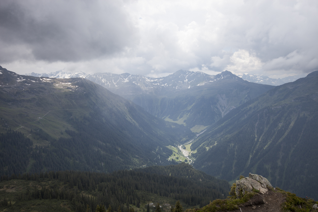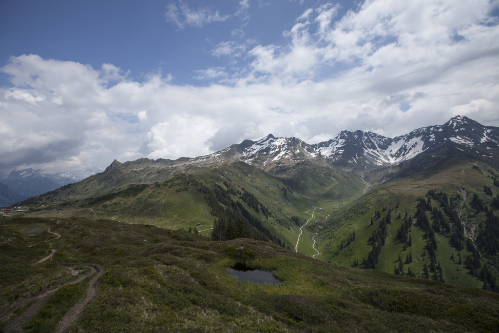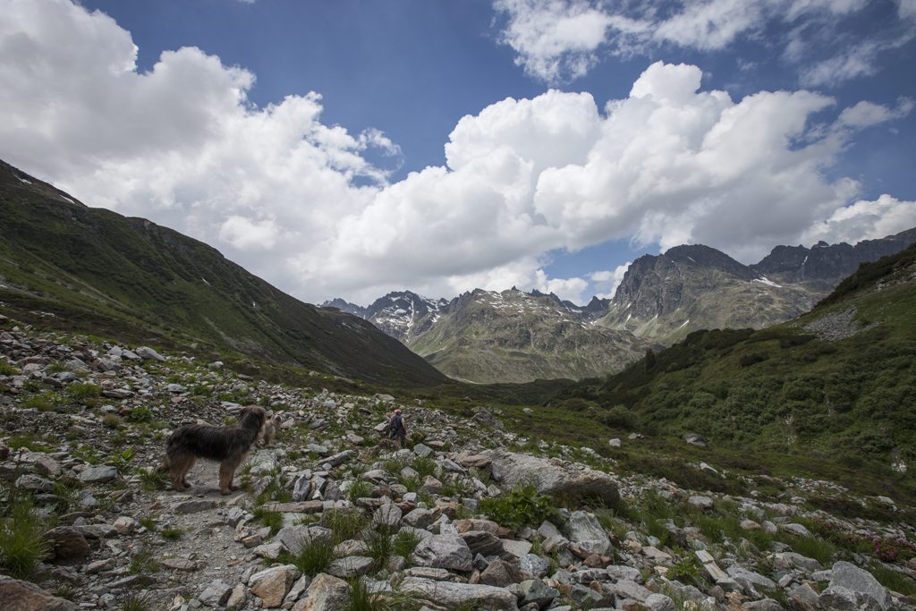 Da wir direkt an der Silvrettahochalpenstrasse waren, musste ein Ausflug auf die "Bieler Höhe" natürlich sein. Von dort starteten wir unsere schon alpine Rundtour auf ca. 2400 m, und kamen unterhalb der "Saarbrücker Hütte" vorbei. Einige Schneefelder waren zu überqueren und auch eine provisorische Brücke stellten Herausforderungen für Mensch und Hund.
